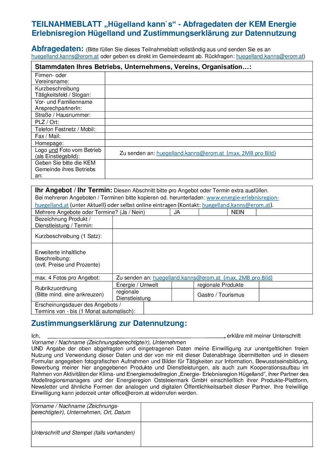 Vollständig ausgefülltes Teilnahmeblatt bitte an info@huegelland-kanns.at senden, bei Fragen erreichen Sie uns auch telefonisch unter +43 664 1259186