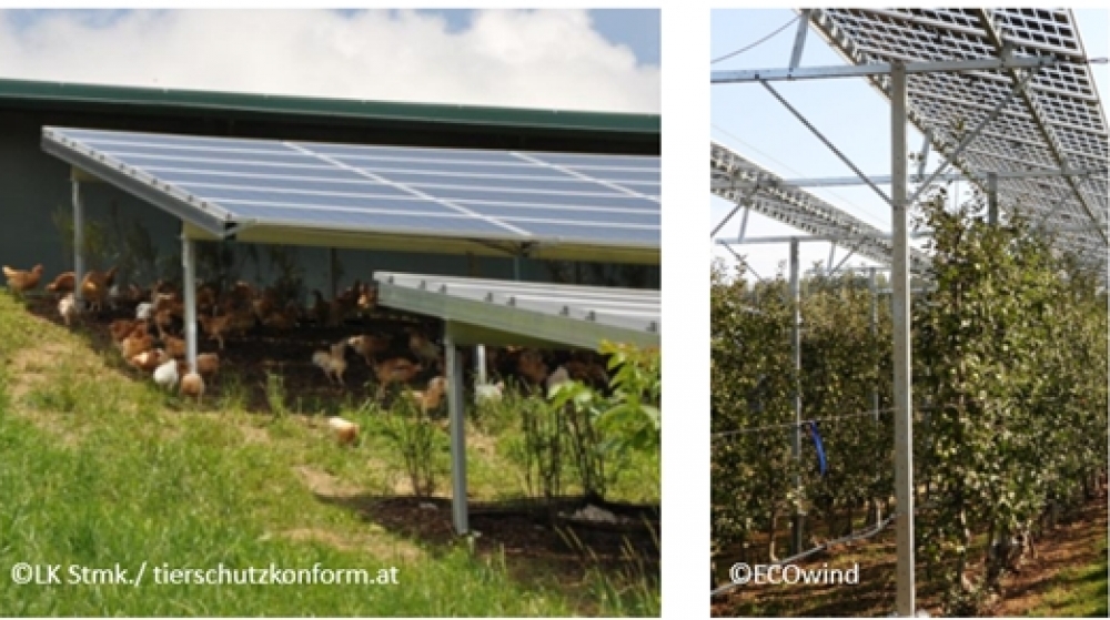 In diesem Zusammenhang sei auf Arbeiten von Herrn Anton Koller (LK Steiermark) in Bezug auf Agri-PV in Hühnerweiden und auf Herrn Dr. Leonhard Steinbauer (Versuchsanstalt Haidegg) in Bezug auf Agri-PV in Raumkulturen (Obstplantagen) mit jeweils vielversprechenden Ergebnissen verwiesen. In Abbildung 2 (Darstellung Agri-PV Anlagen – links: Hühnerweiden & rechts: Apfelplantage) ist eine exemplarische Darstellung einer Hühnerweide mit PV-Anlage (links) und einer Apfelplantage mit semitransparenten PV-Modulen (rechts) ersichtlich.