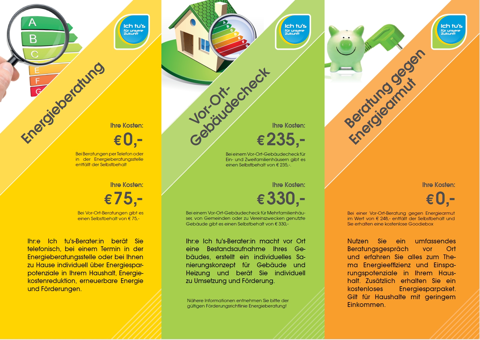Fachkundige Energieberater:innen geben Ihnen Auskunft zu den Themen Neubau bzw. Sanierung eines Einfamilienhauses, Erneuerung oder Verbesserung der Heizungsanlage, Einbau einer Solaranlage, Fragen zu Energiesparmaßnahmen, Anschaffung energiesparender Elektrogeräte, Auskunft zu Förderungen u.v.m.