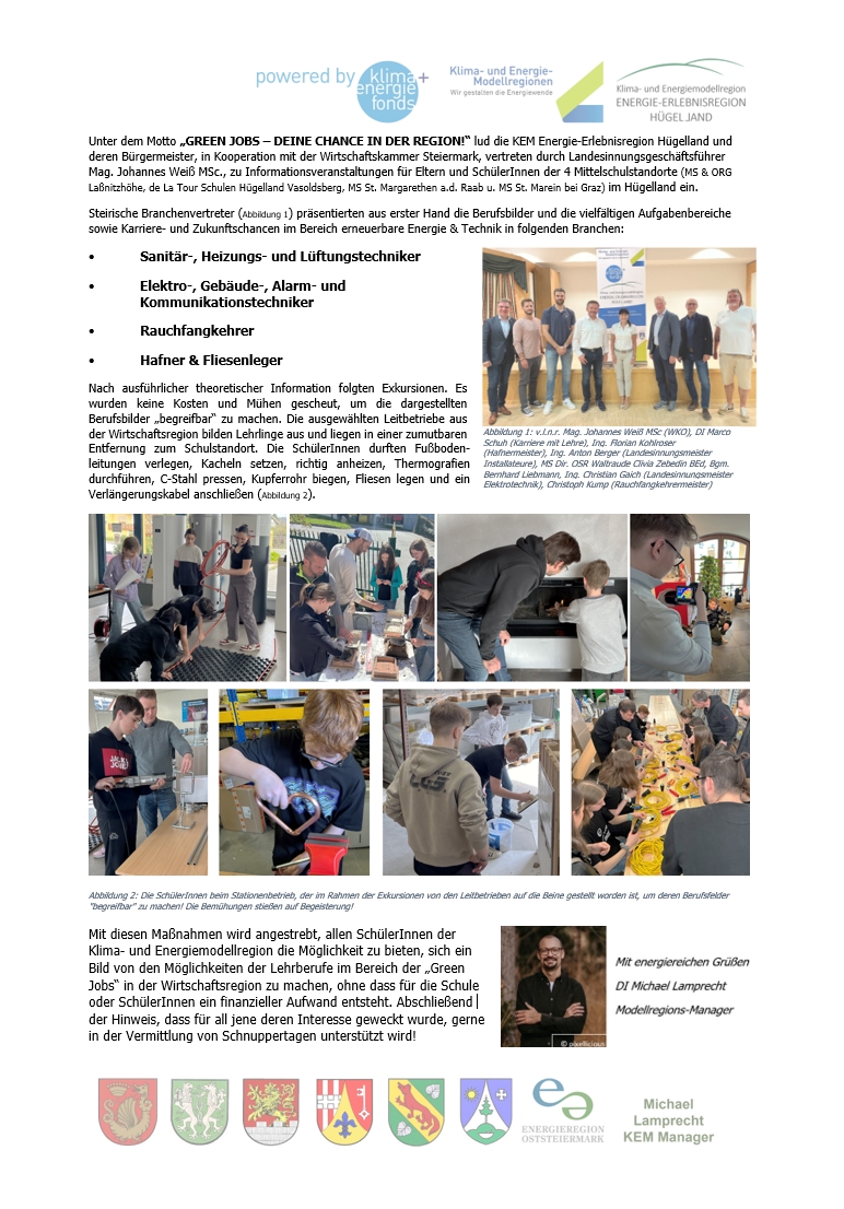 Aus diesem Grund bietet die KEM den Schulen aus der Energie-Erlebnisregion Hügelland eine Unterstützung im Bereich der „Berufsorientierung für Schüler: innen“ an. Das Themenfeld erstreckt sich von Informations– und Auftakts-Veranstaltungen, Unterrichtseinheiten zum Thema „Energie und Klimawandel“, bis hin zu Exkursionen mit der Möglichkeit zur Schnupperlehre in lokalen Leitbetrieben. Hervorzuheben ist in diesem Zusammenhang, dass es sich um ein zum Schulprogramm ergänzendes Angebot handelt und keine Kosten für Schulen und Schüler: innen anfallen.