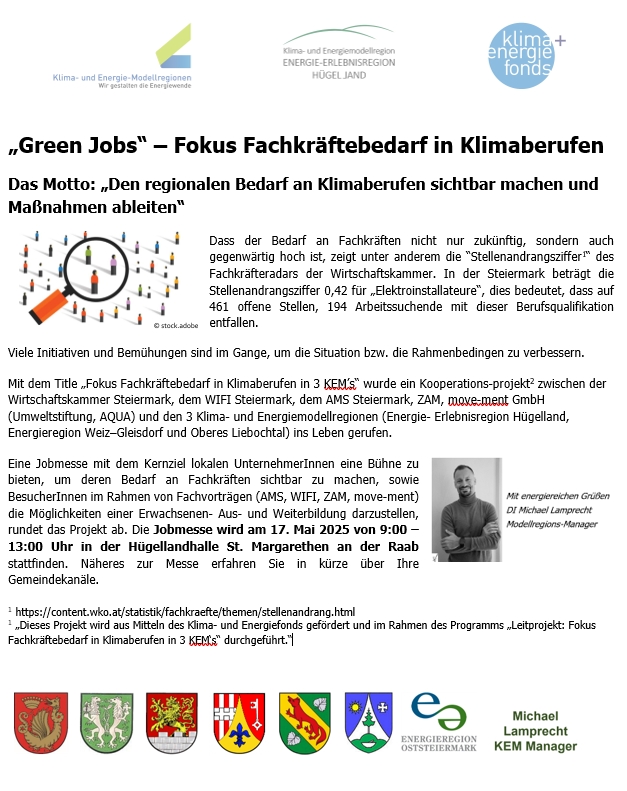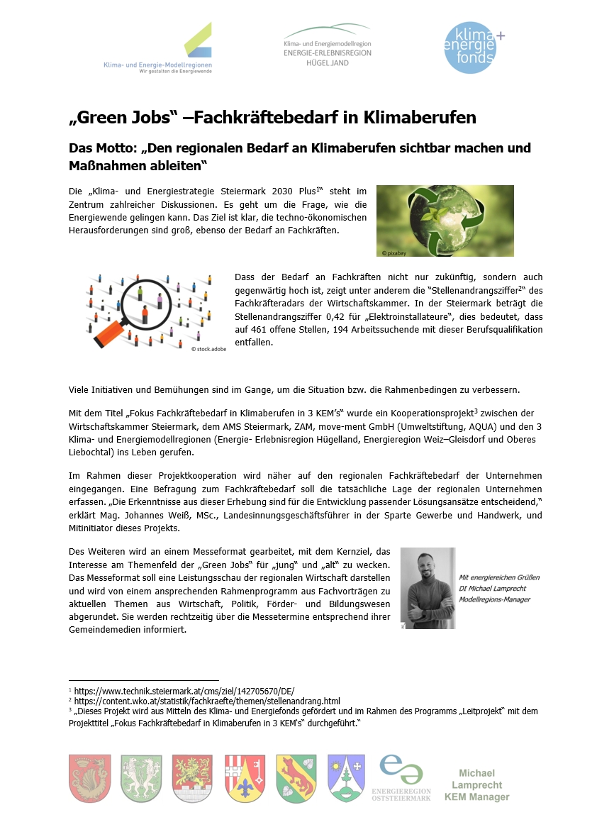 in diesem Kurzbeitrag geht es um „Green Jobs“ und welche Aktivitäten die KEM „Energie-Erlebnisregion Hügelland“ zu diesem Thema verfolgt. „Green Jobs“ ein Synonym für zukunftsträchtige Arbeitsplätze, per Definition der Europäischen Union: „Arbeitsplätze in der Herstellung von Produkten, Technologien und Dienstleistungen, die Umweltschäden vermeiden und natürliche Ressourcen erhalten.“